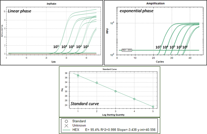 After the reactions have been completed, produce equation, estimate efficiency and R2. If efficiency is between 90-110% and R2 value in above 0.98 then proceed to quantification. One may exclude reactions that do not conform with the expected values.