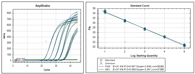 Certified as DNase-RNase free using fluorescently labeled RNase and DNase probes. Efficiency between 90-110%, with R2 value >0.99 of each lot is estimated by a standard curve assay produced over 5 logs IVT RNA substrate dilutions. Stock provided by waste-water surveillance lab of Thesaloniki and quantified at 8 x106 cp/μL for Flu A and 1.2 x 107 cp/μL for Flu B targets.