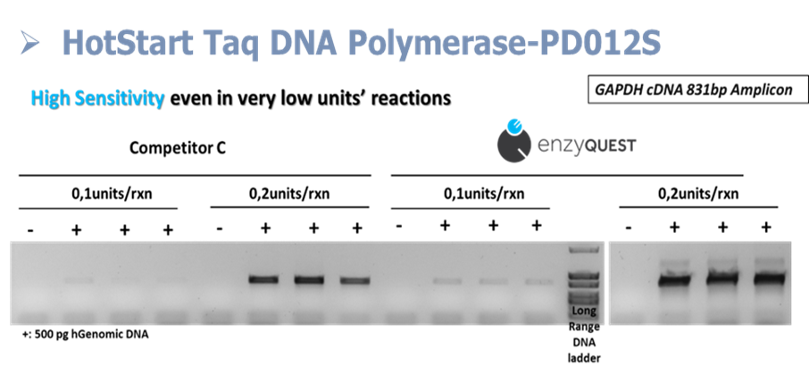 Highly robust detection of targets from human genomic DNA, even with minute amounts of enzyme units per reaction vs a competitor that uses the same chemistry for Hot start Taq DNA pol. preparation.